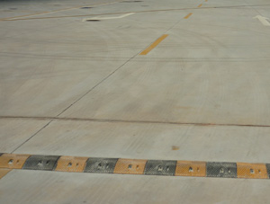 接著,將減速帶規(guī)范擺放好,按黃黑相間擺放擺直,再在兩個邊上各加上一個邊頭。